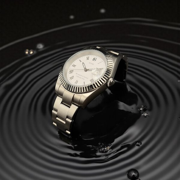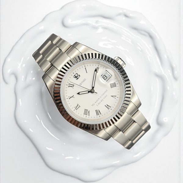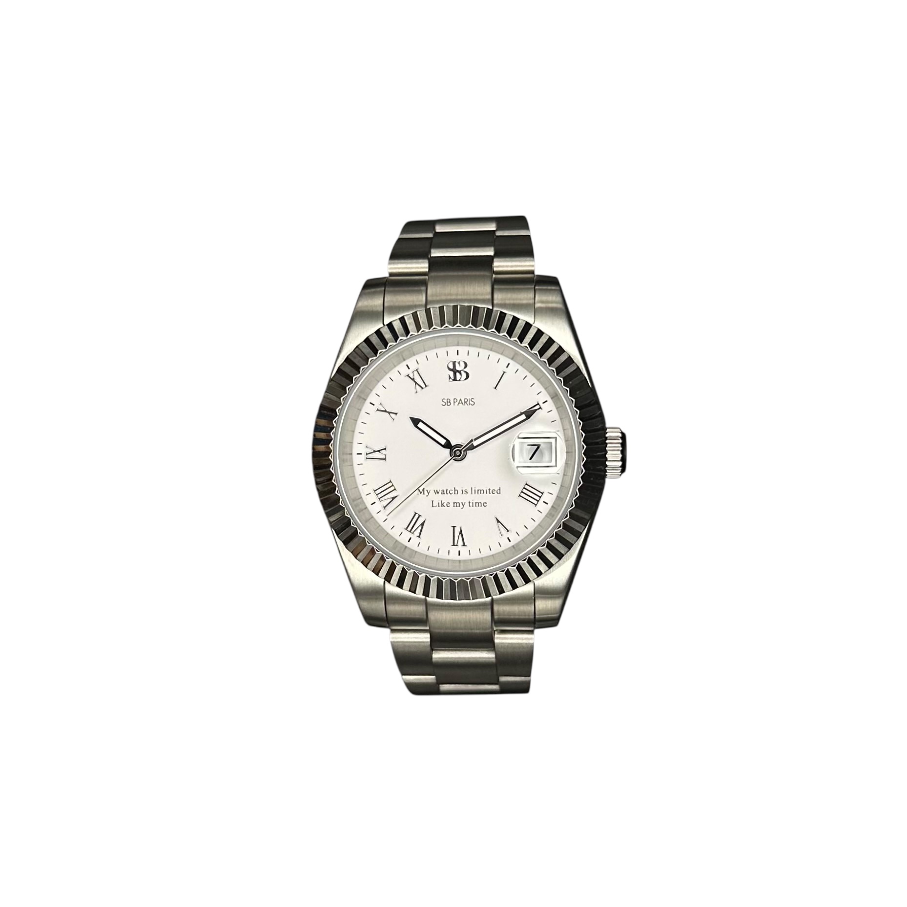 Boitier de 39mms en acier inoxydable brossé, lunette cannelée polie et verre saphir avec loupe de date.
